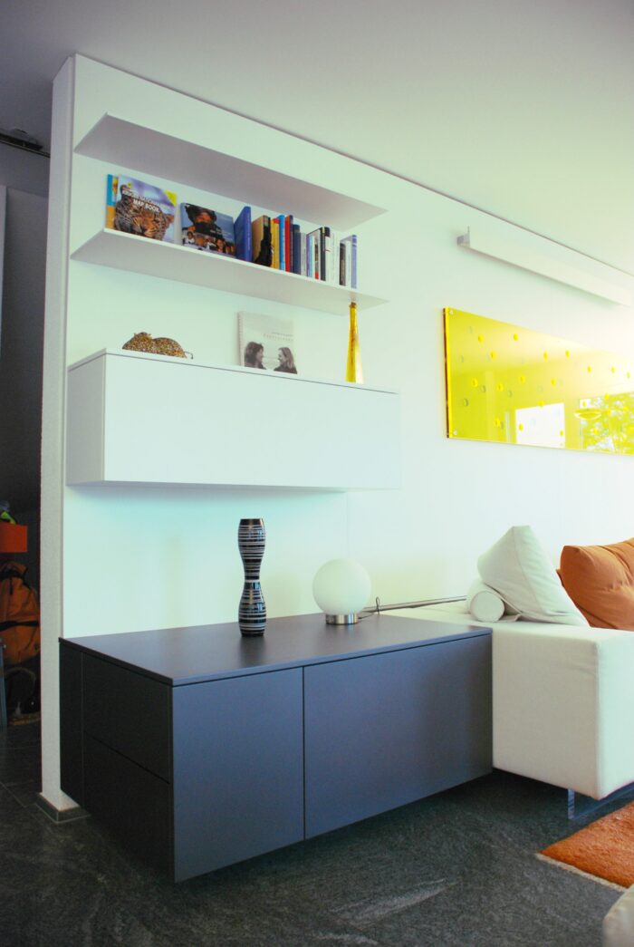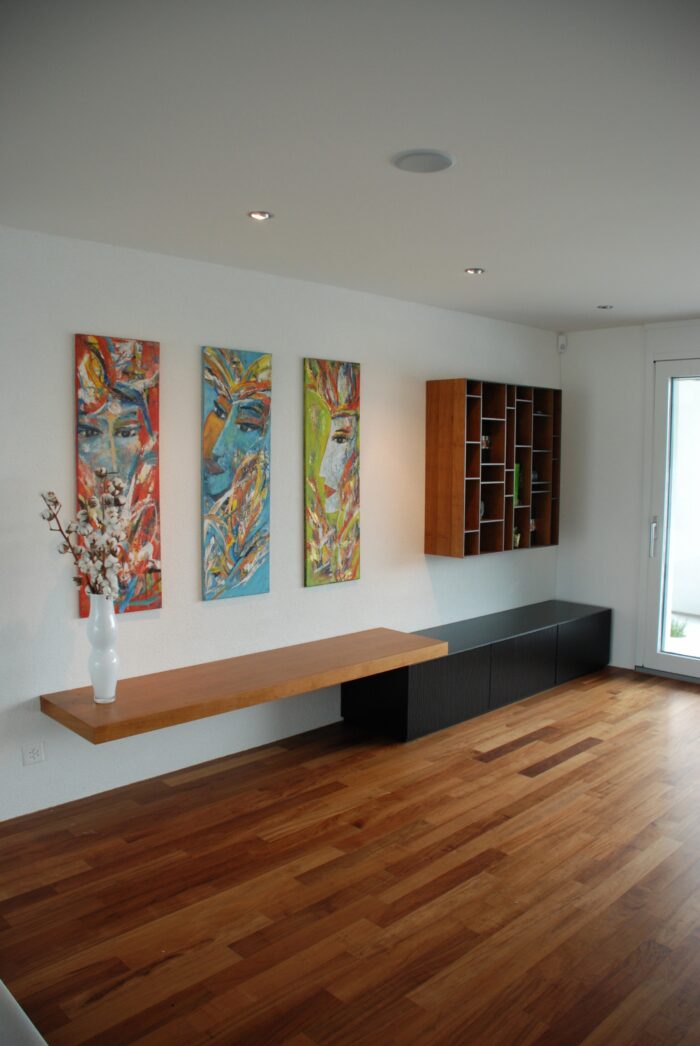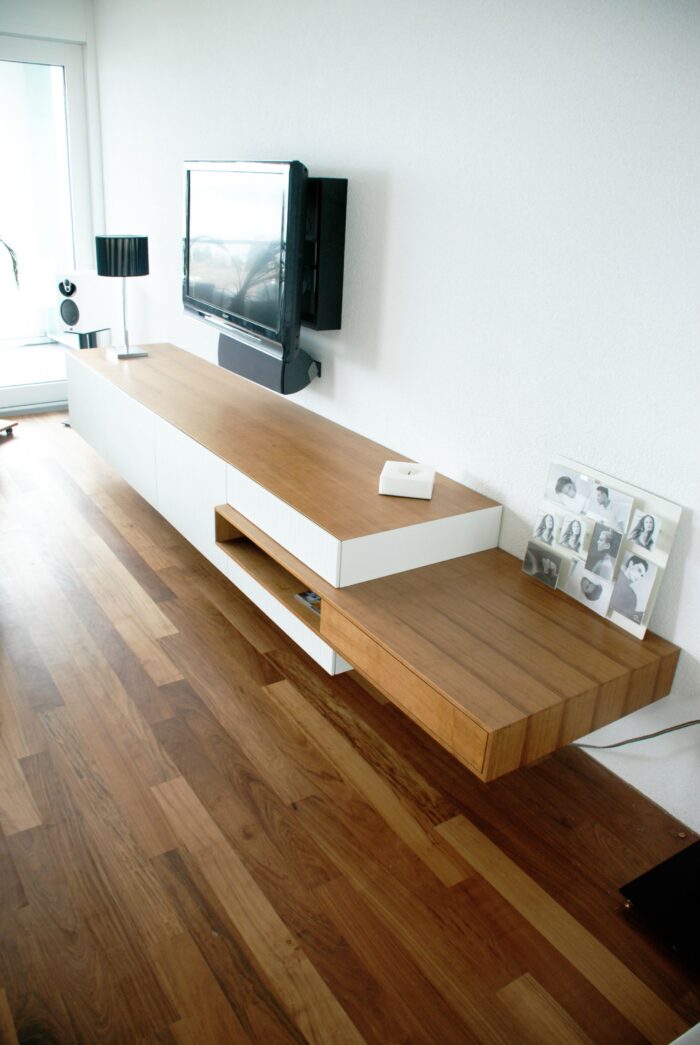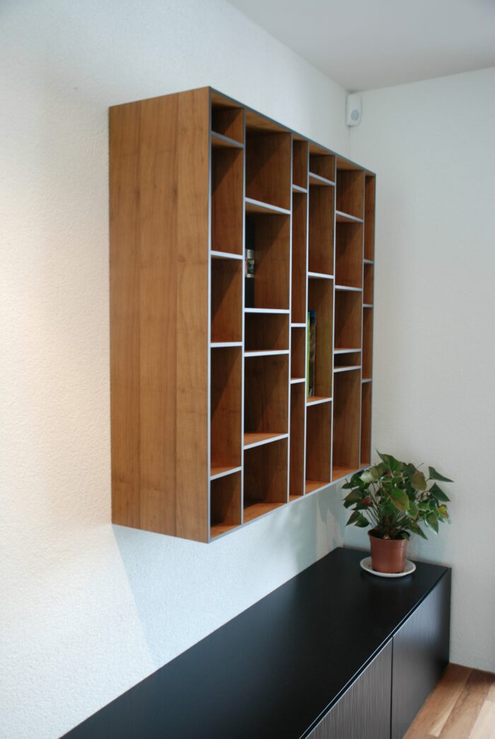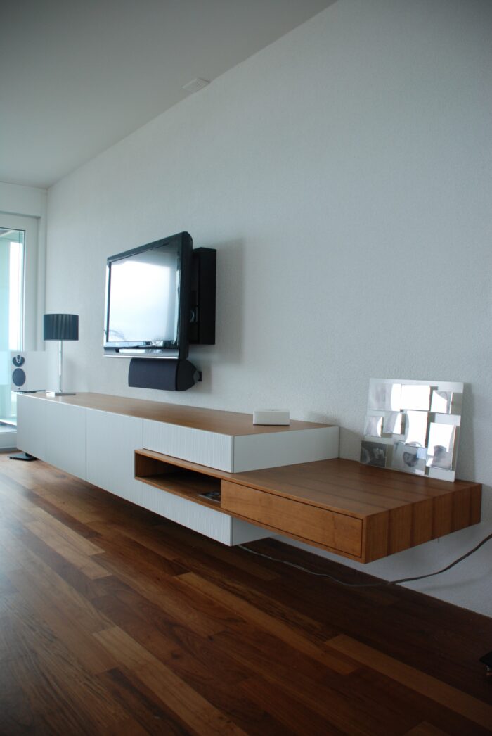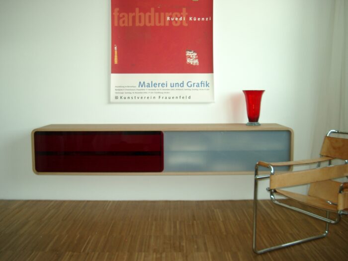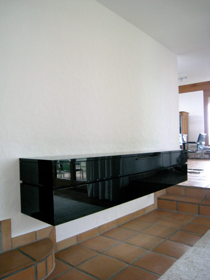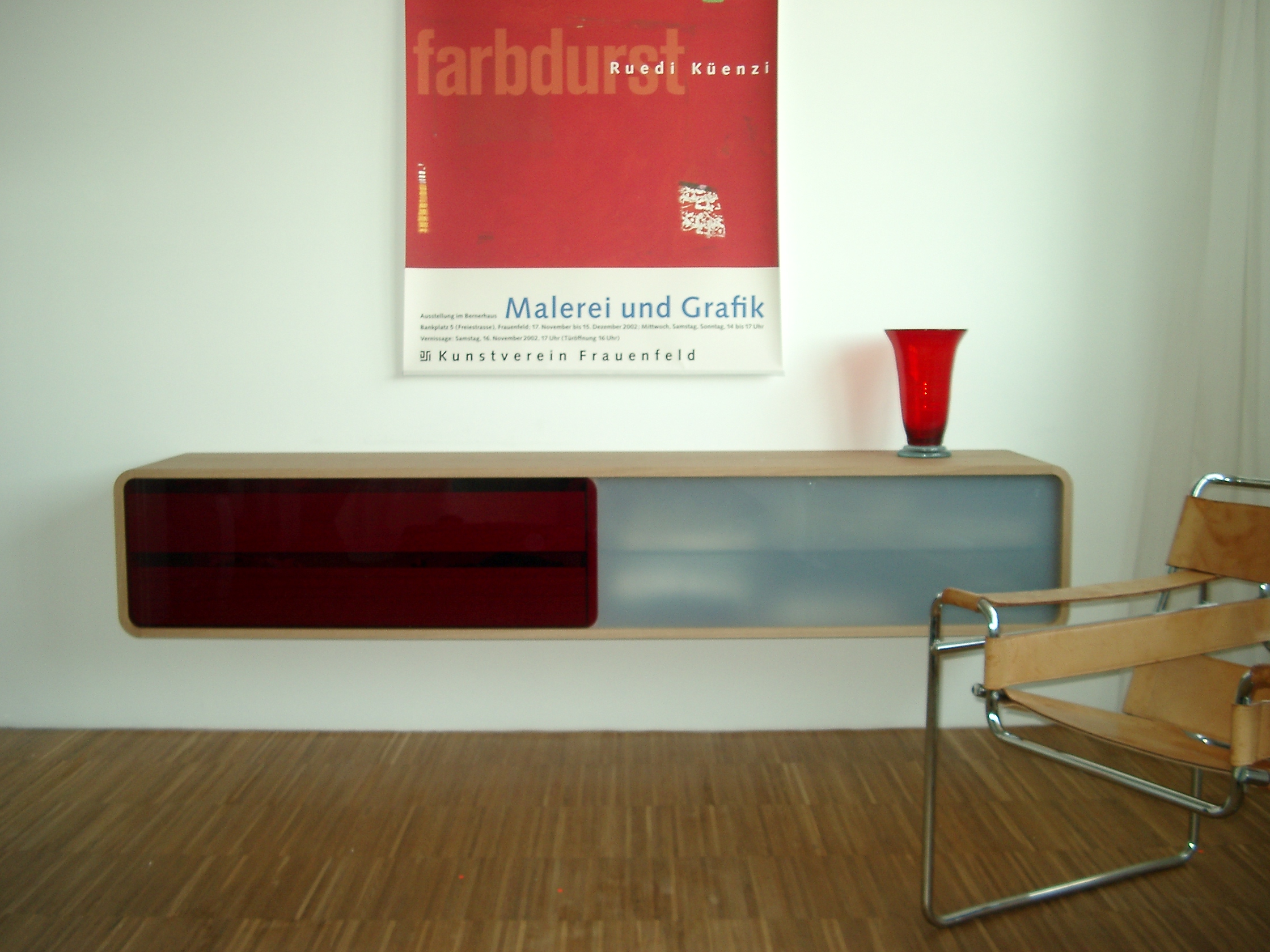 Breite: 1500, 1800, 2100mm. Höhe: 374, 555, 724mm. Tiefe: 410mm. Ausführungen MDF spritzlackiert nach RAL/NCS oder Echtholz furniert. Fuss: Metall pulverbeschichtet schwarz, weiss, (Höhe 170mm). Ohne Fuss als Wandmontage.