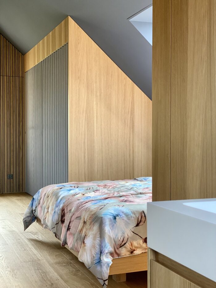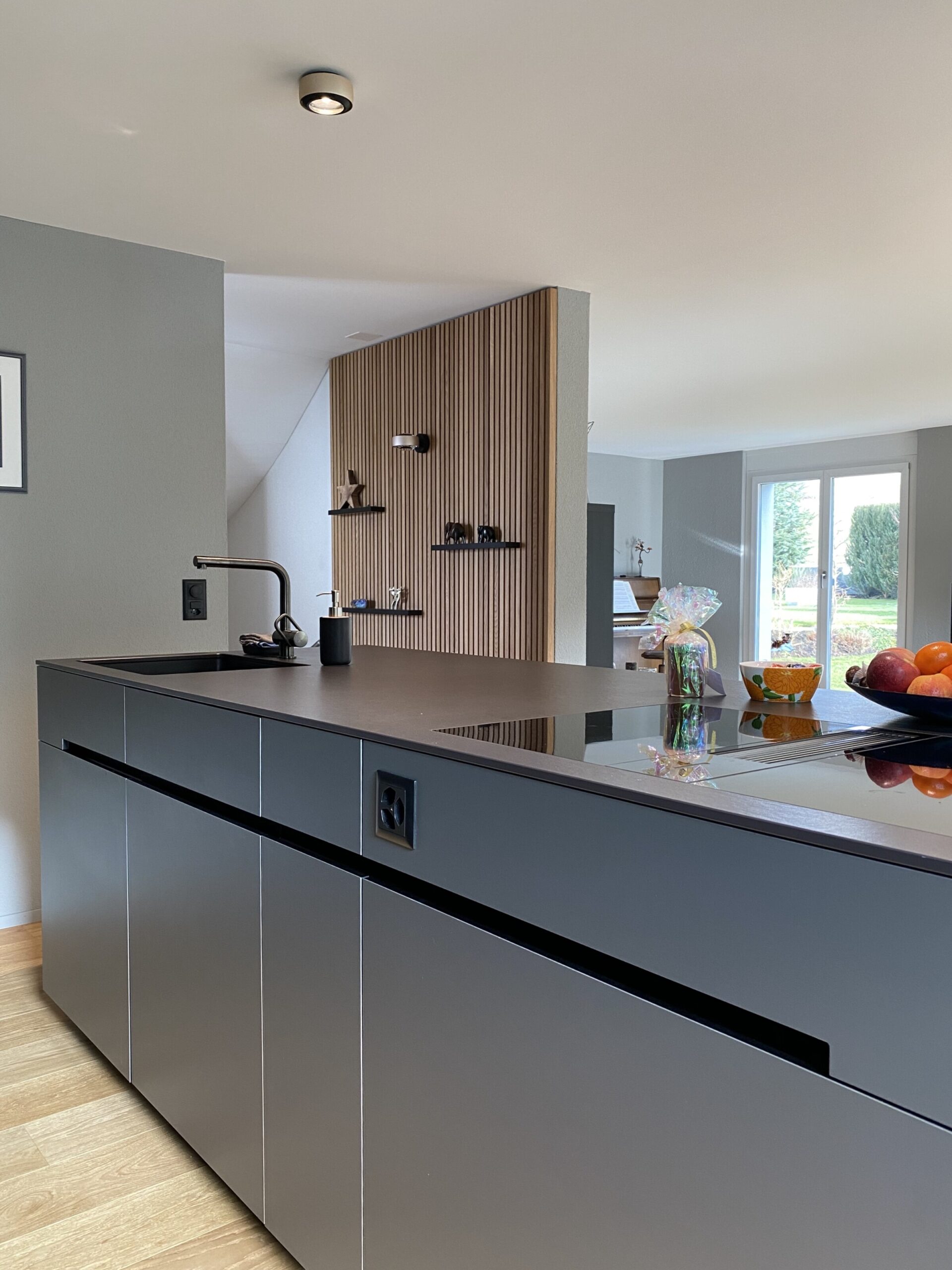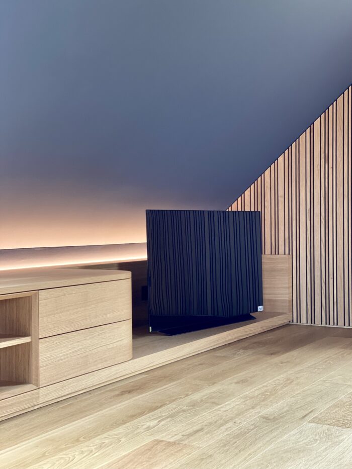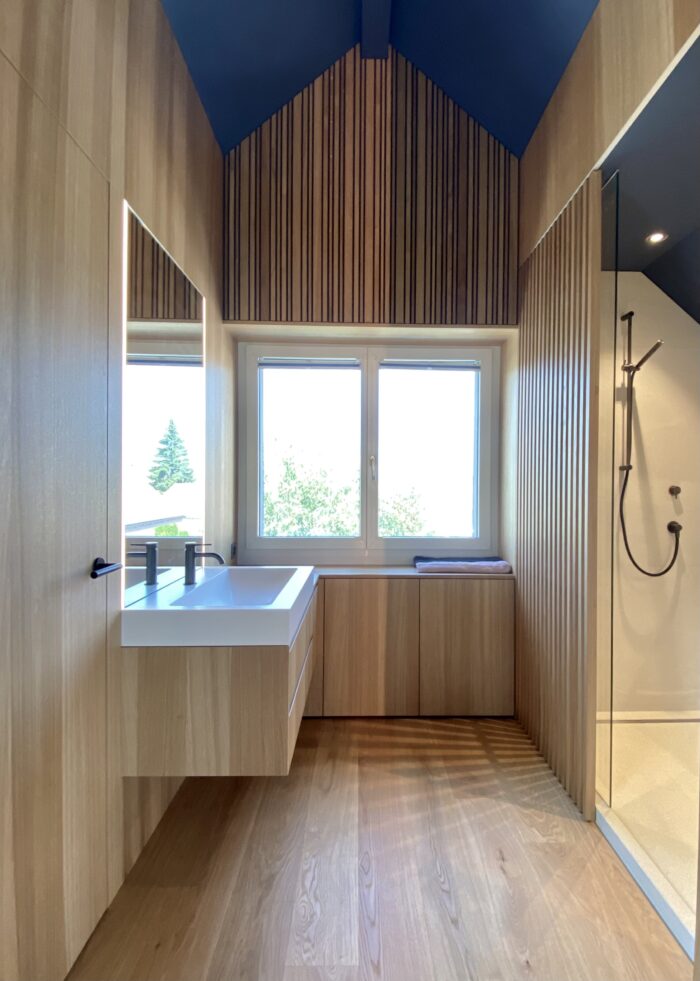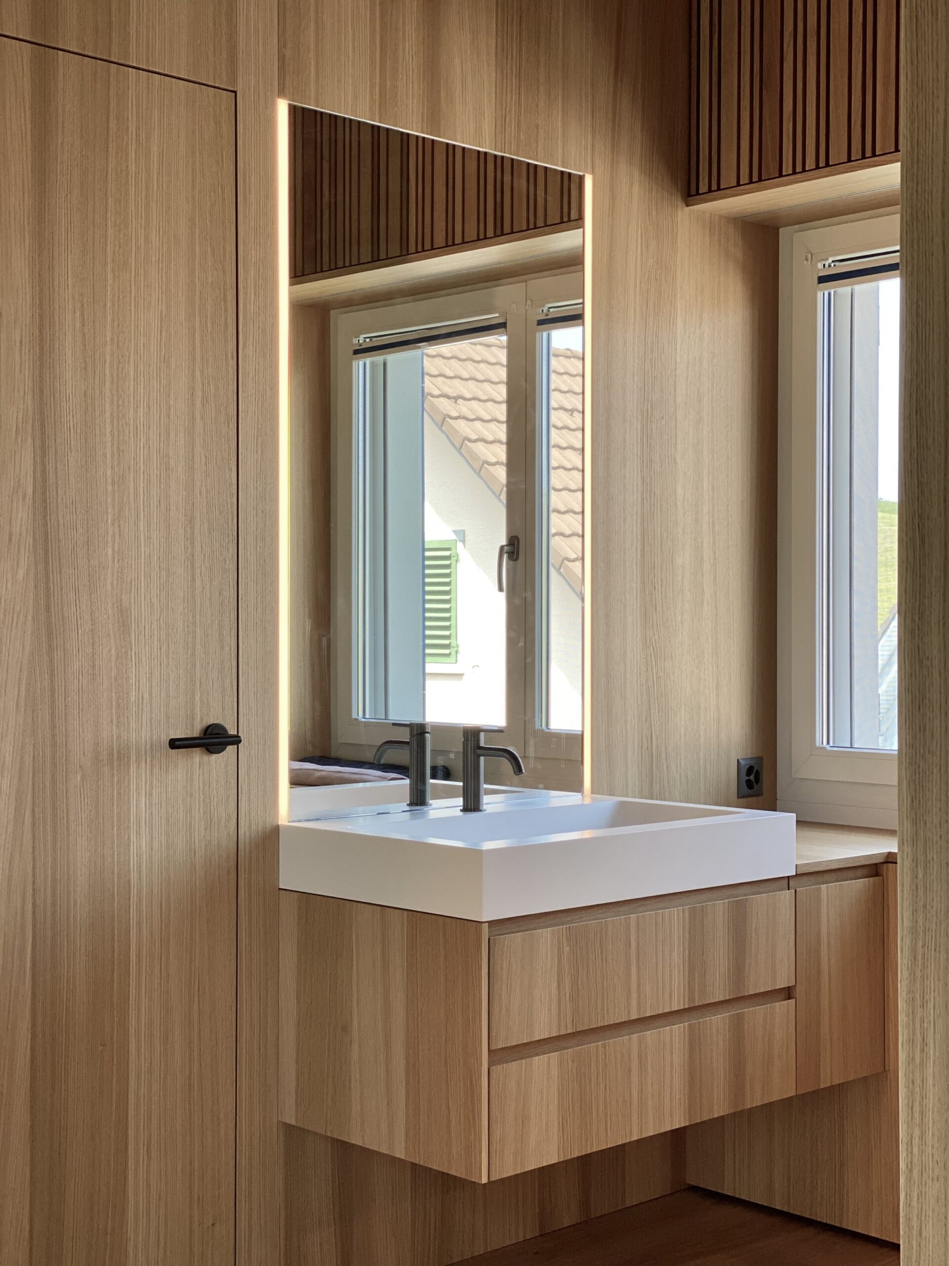 Zurück Dachausbau, Küche und Entrée Haus Schmid Ausführung von Wandverkleidungen, Nasszellen, Möblierung, Lichtkonzept.Materialien: Eiche, Neolith, Faltvorhänge, Aluduro, Glas. Foto: Reto Weiss