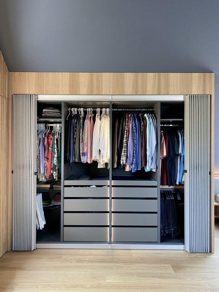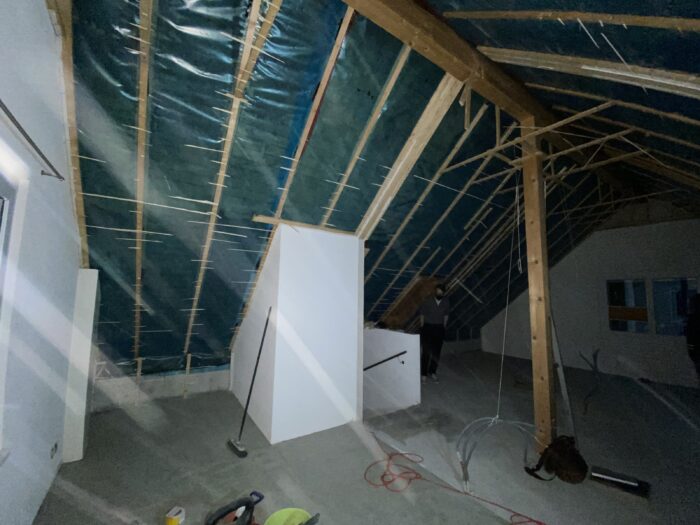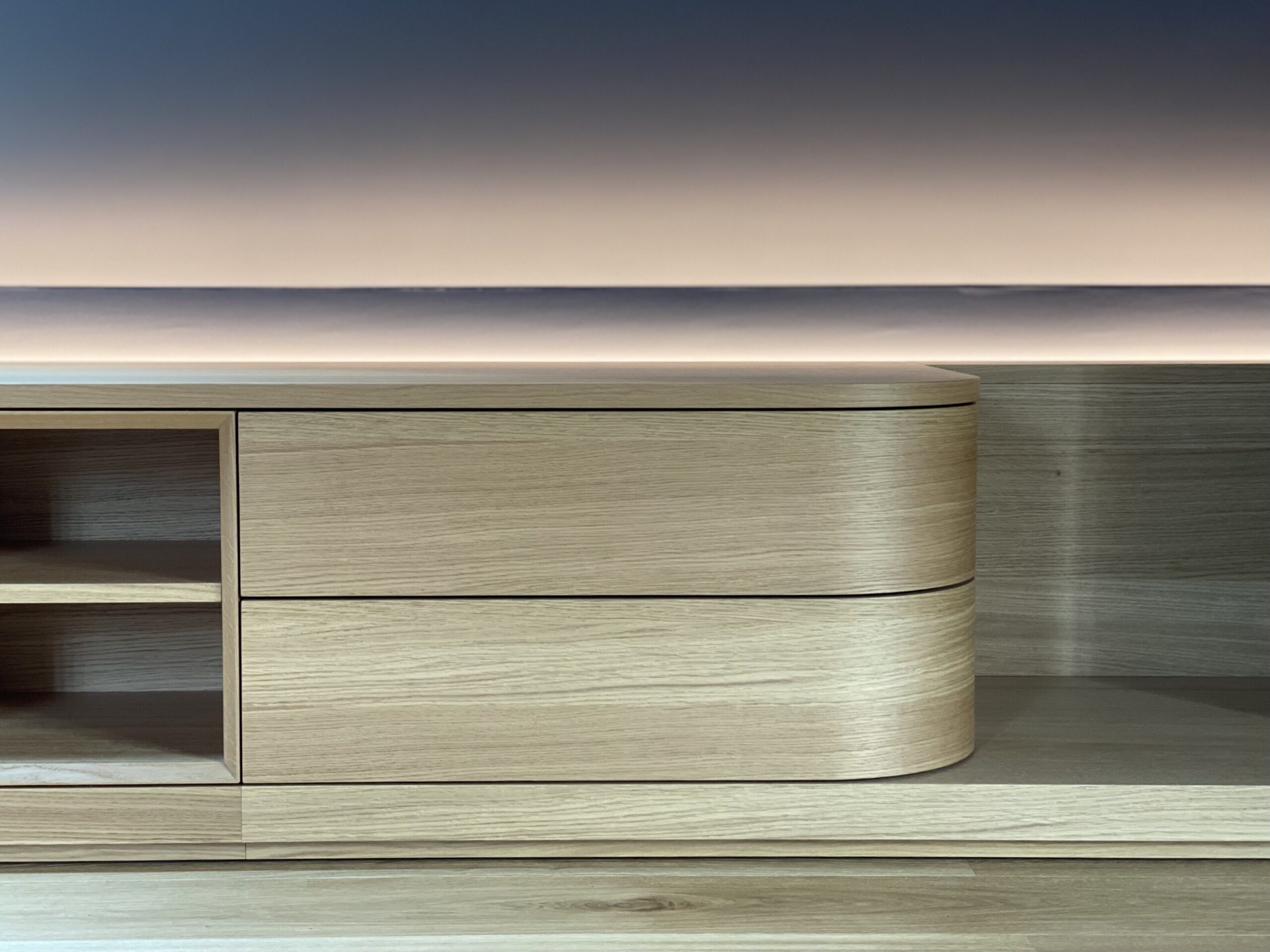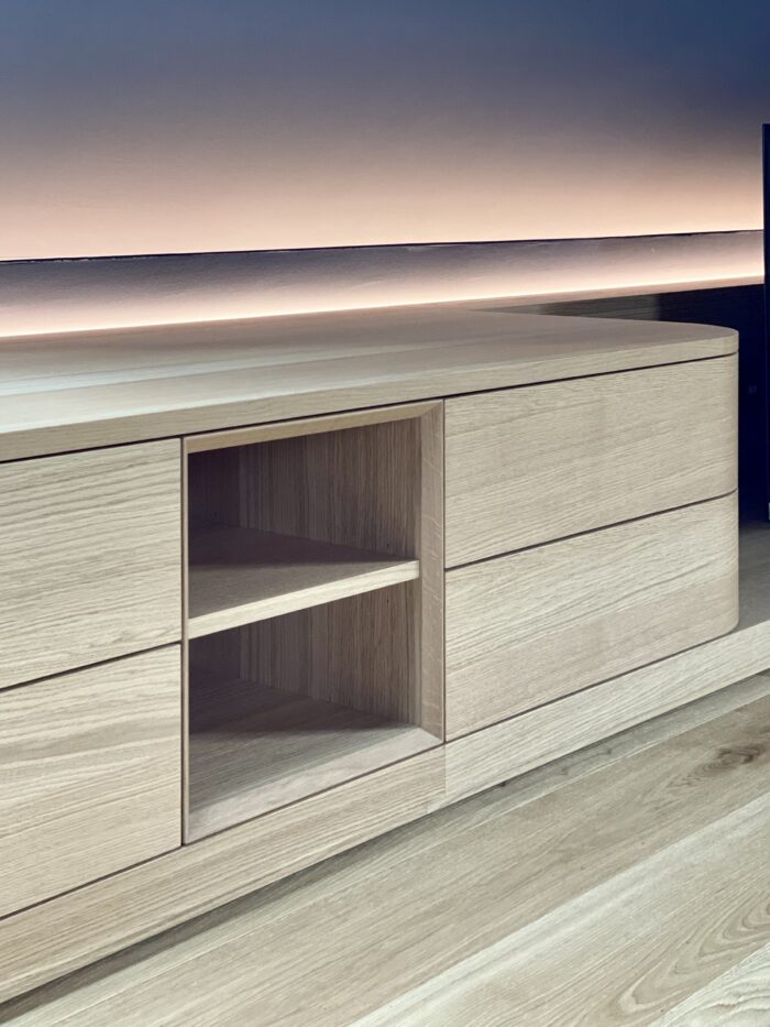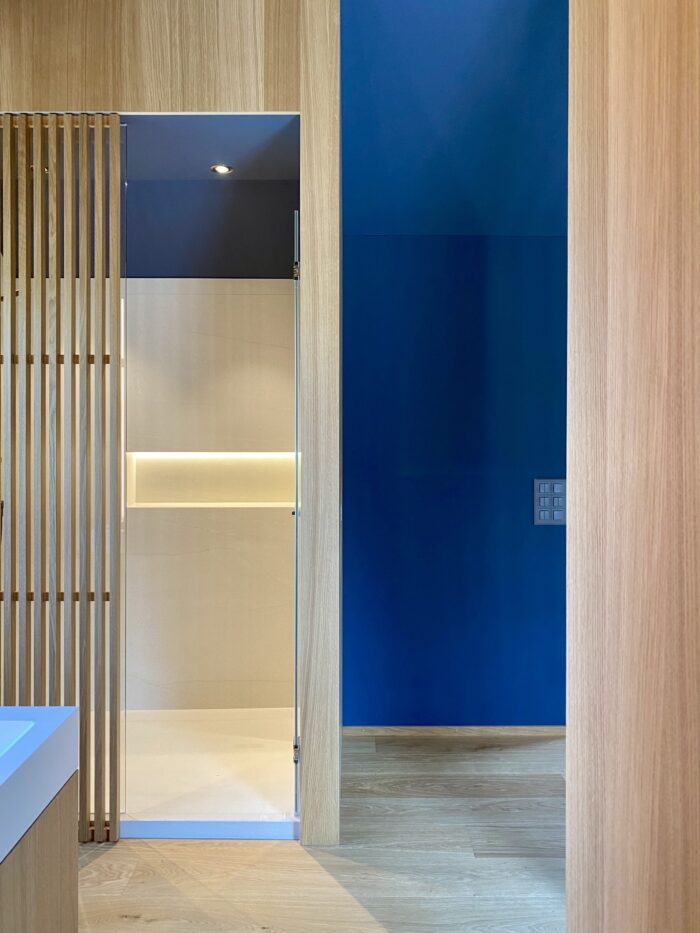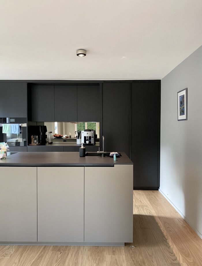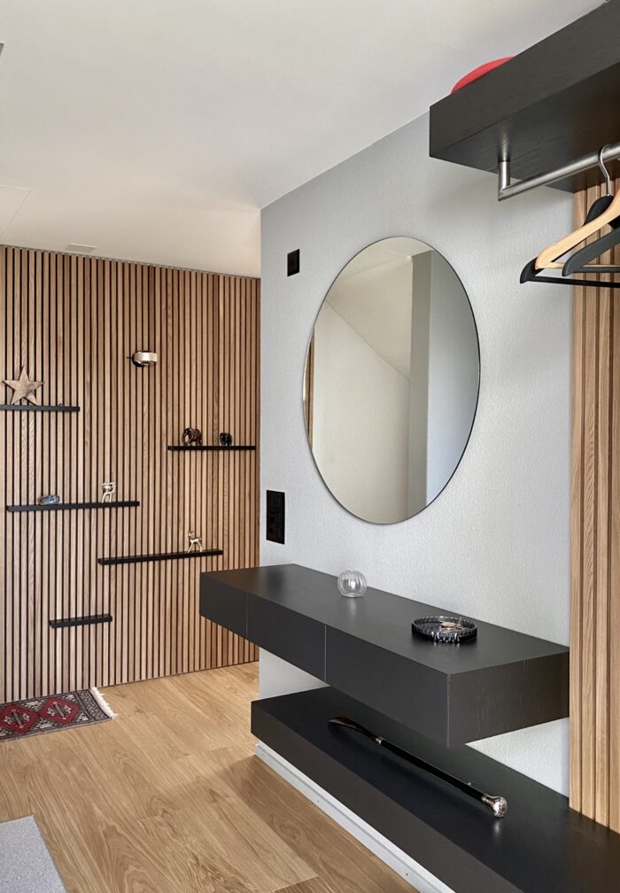 Zurück Dachausbau, Küche und Entrée Haus Schmid Ausführung von Wandverkleidungen, Nasszellen, Möblierung, Lichtkonzept.Materialien: Eiche, Neolith, Faltvorhänge, Aluduro, Glas. Foto: Reto Weiss