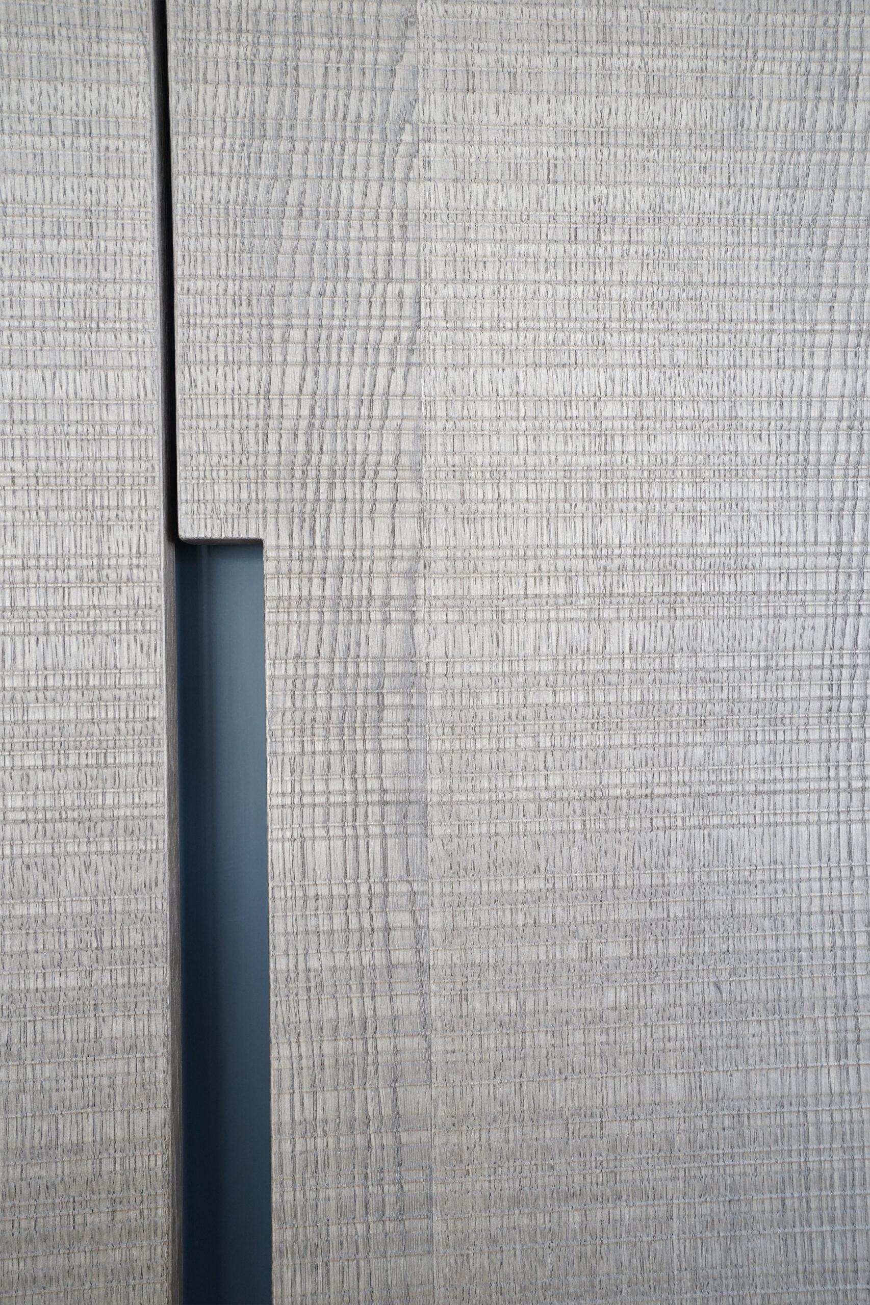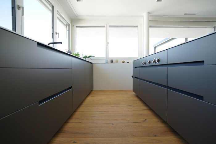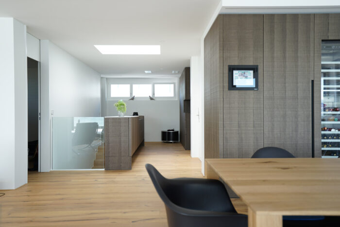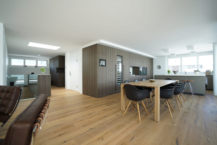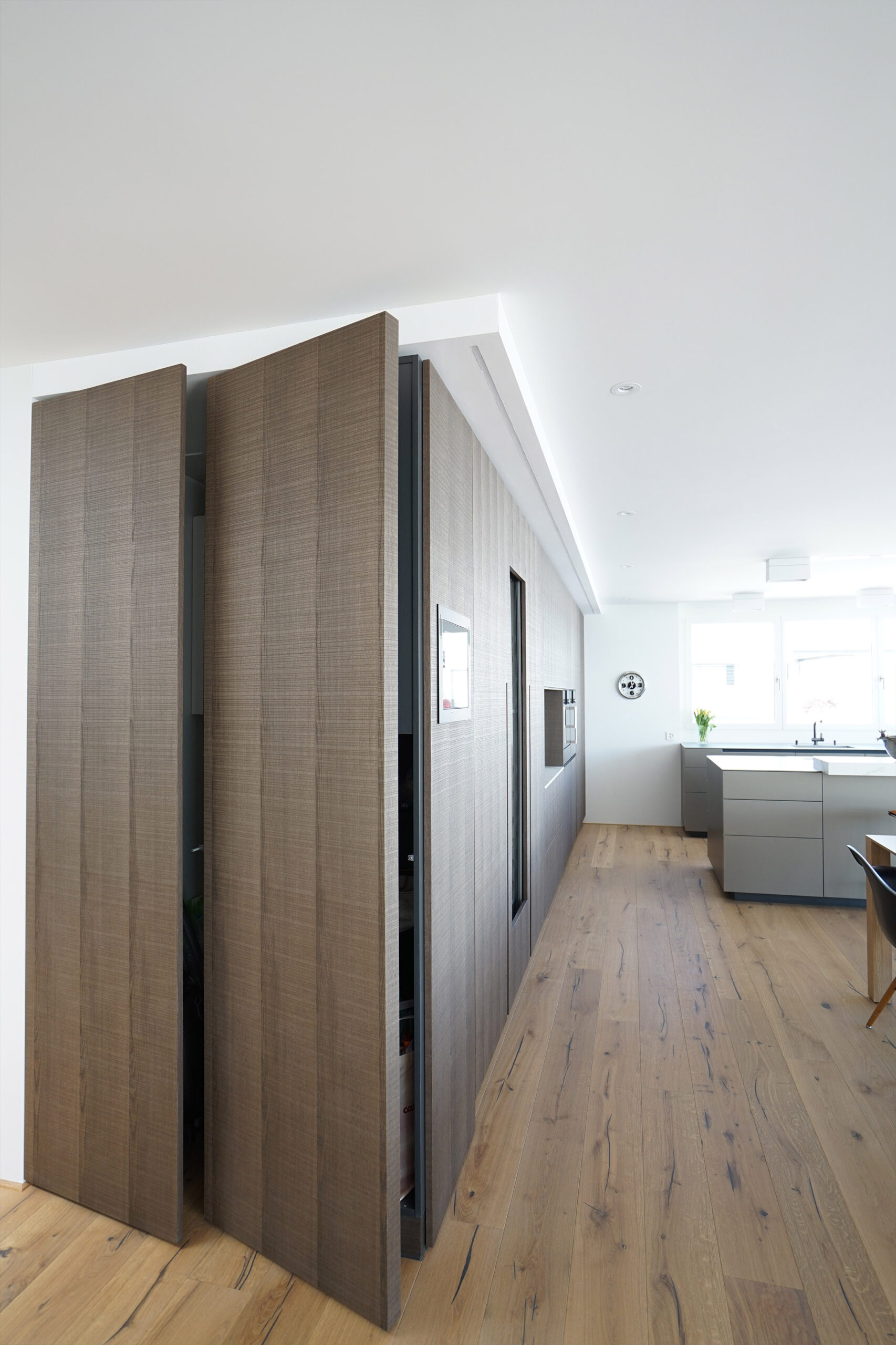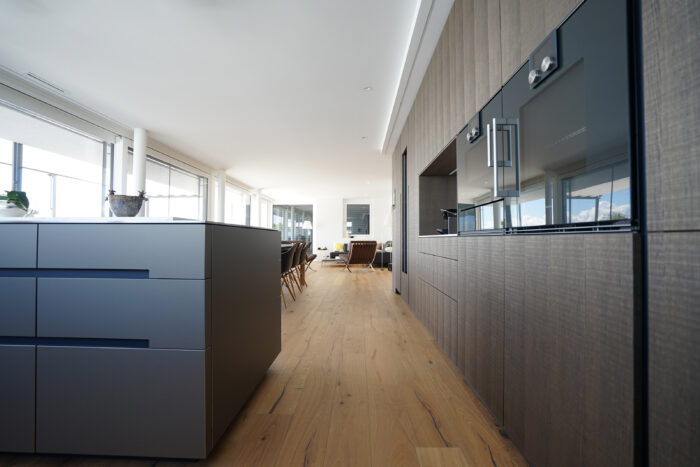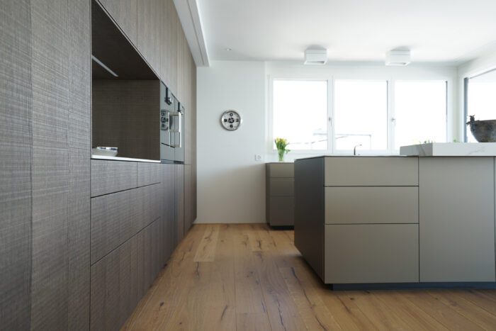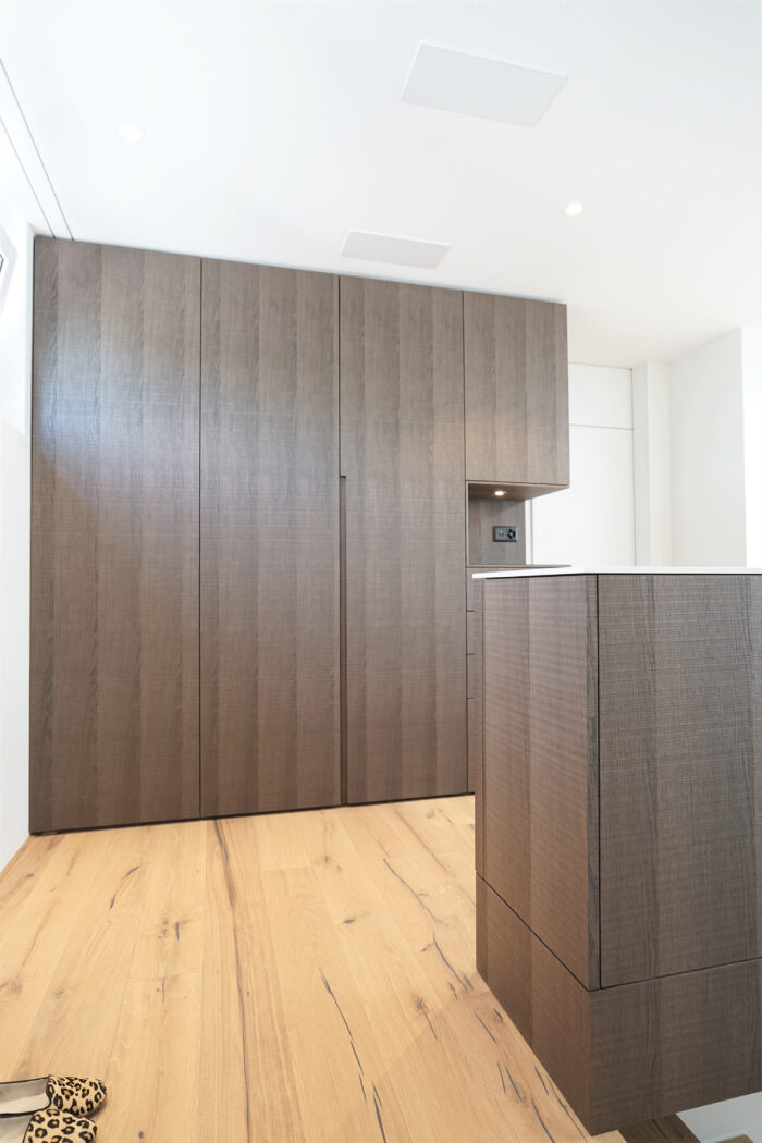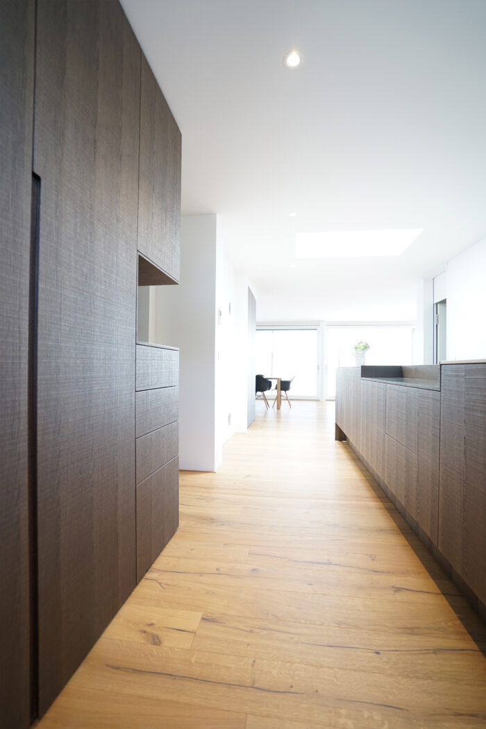Zurück Neubau Attika Wohnung Richterswil Ausführung von Küche, Entréebereich, Ankleide.Material: Neolith Calacatta, Edelstahl Ice Design, Eiche sägeroh grau, Aluduro, integrierte LED Beleuchtung. Architektur: Hatt und Partner AGFotos: Reto Weiss