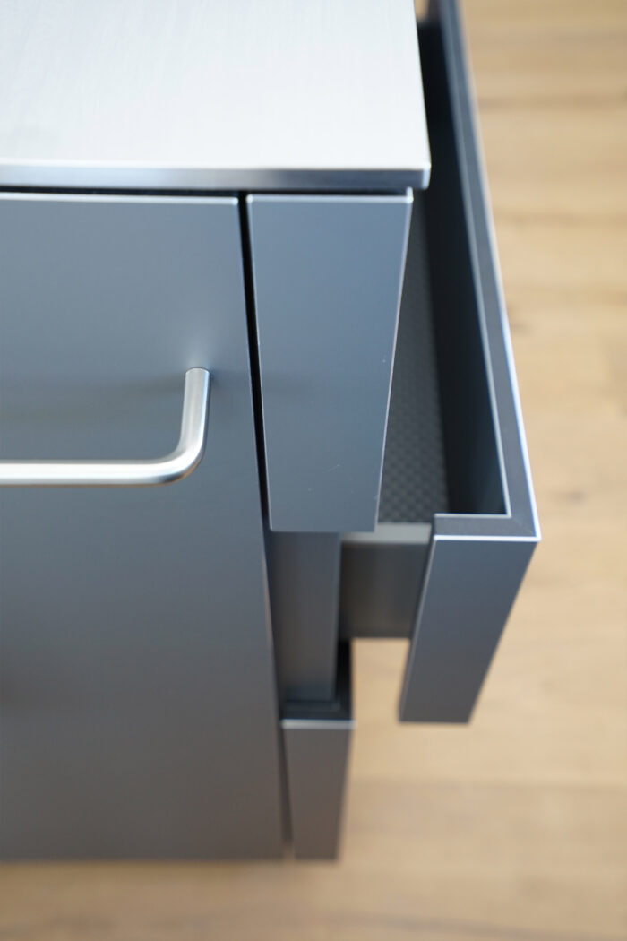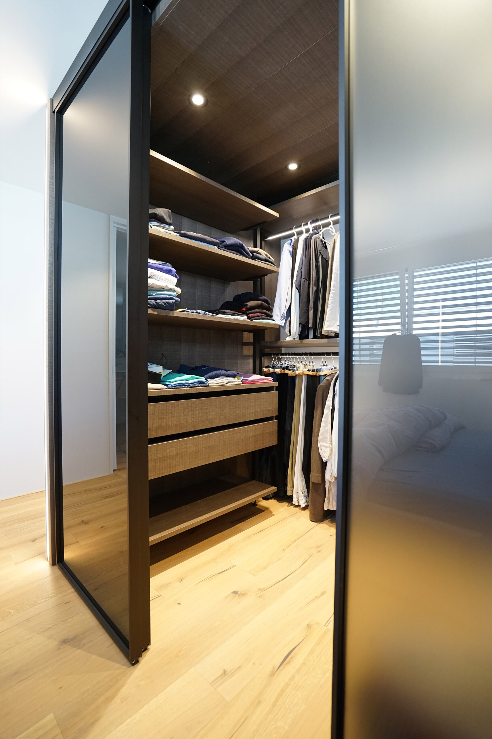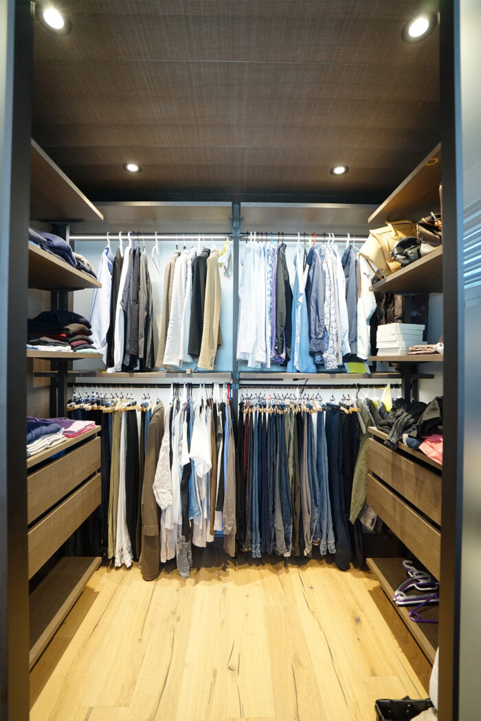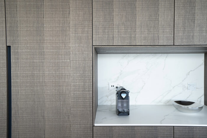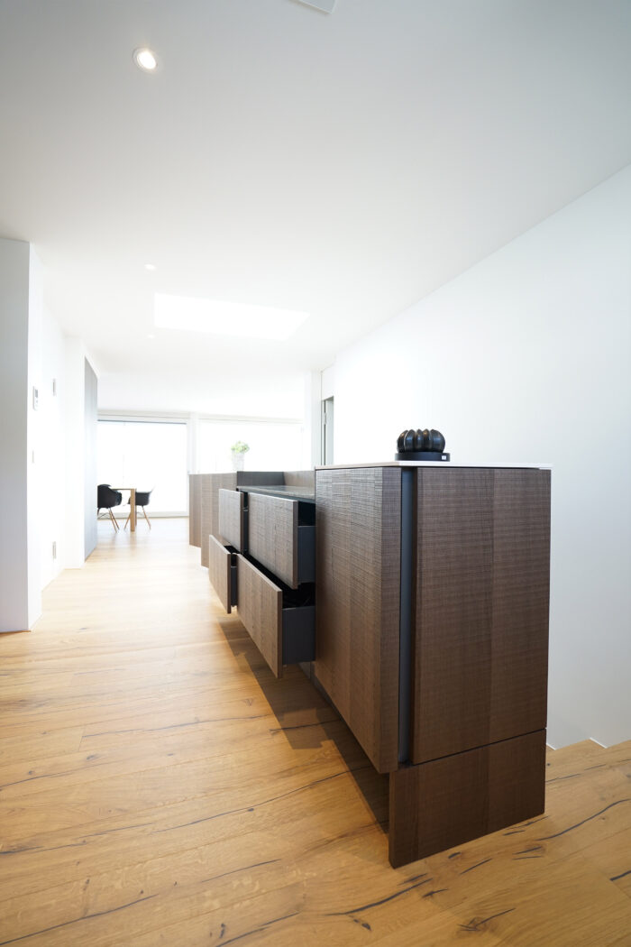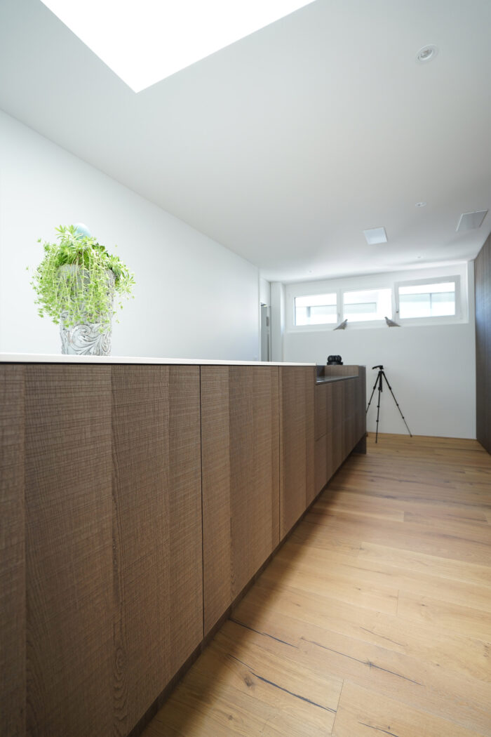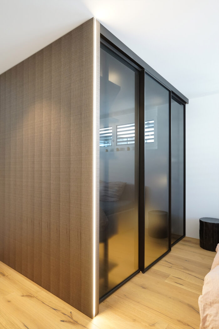 Zurück Neubau Attika Wohnung Richterswil Ausführung von Küche, Entréebereich, Ankleide.Material: Neolith Calacatta, Edelstahl Ice Design, Eiche sägeroh grau, Aluduro, integrierte LED Beleuchtung. Architektur: Hatt und Partner AGFotos: Reto Weiss