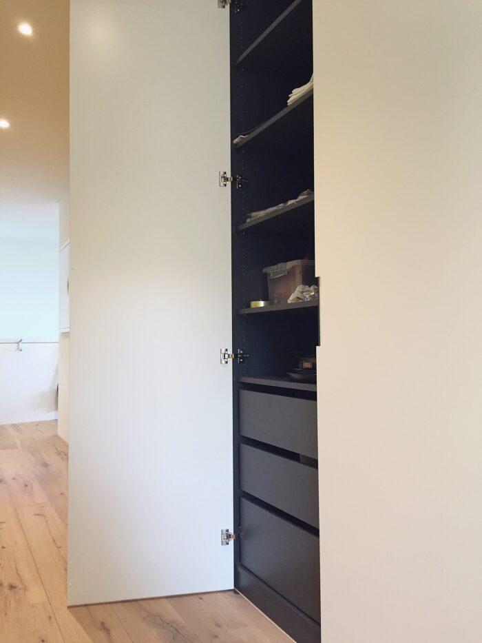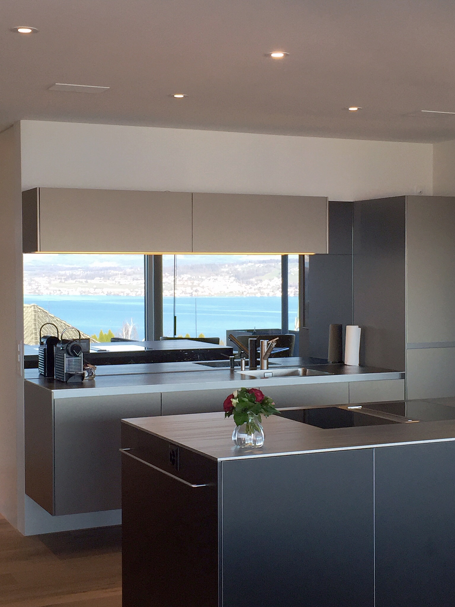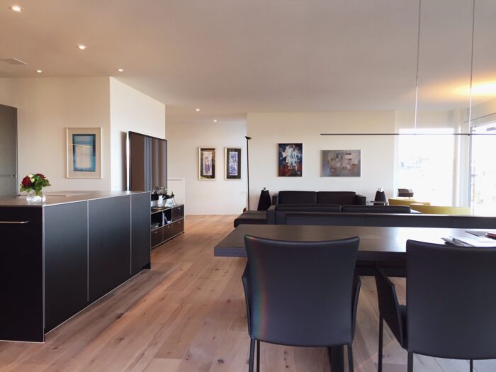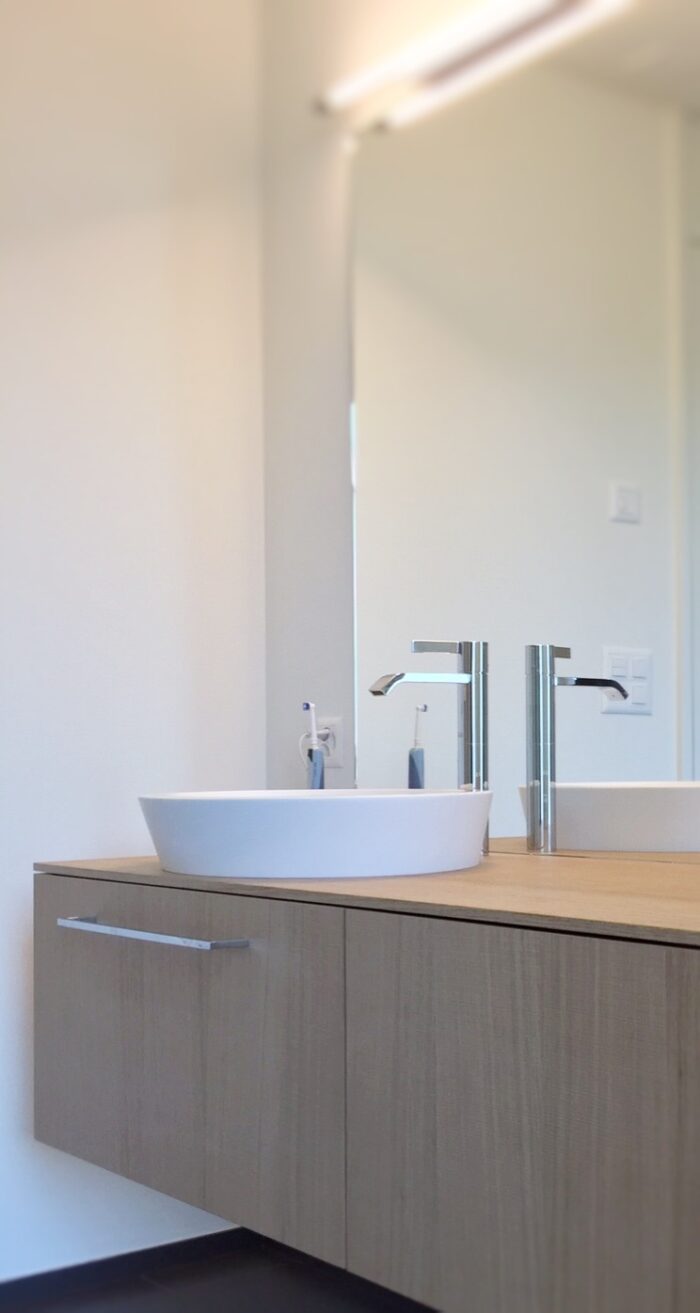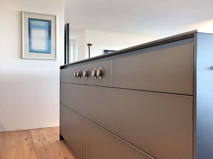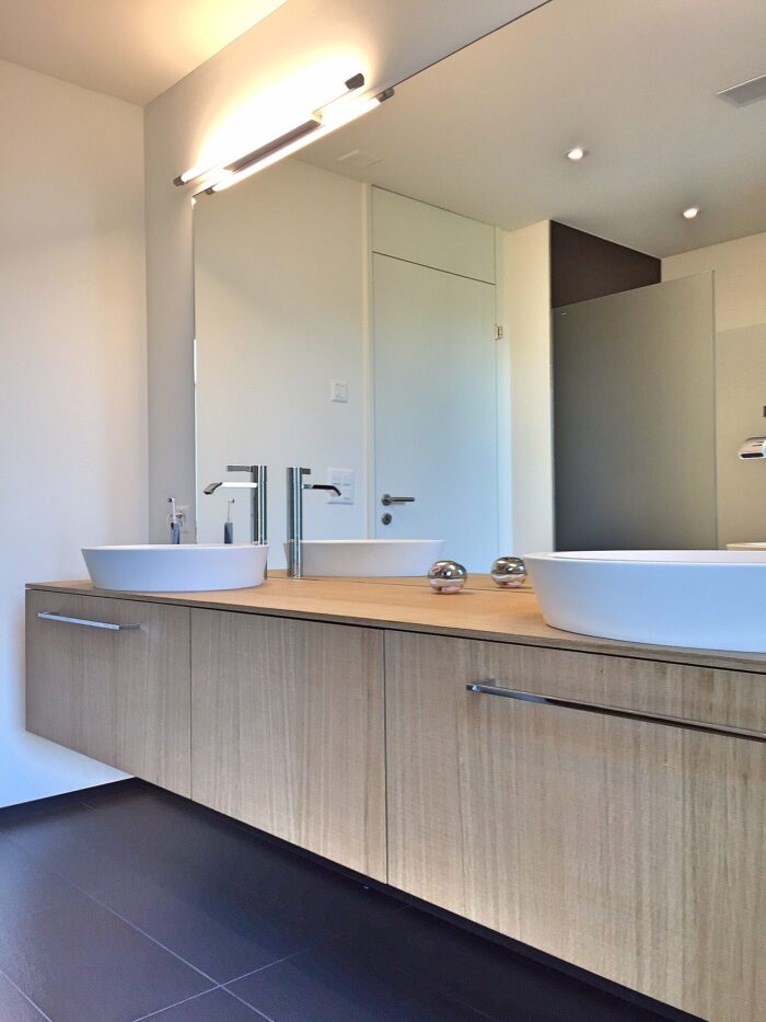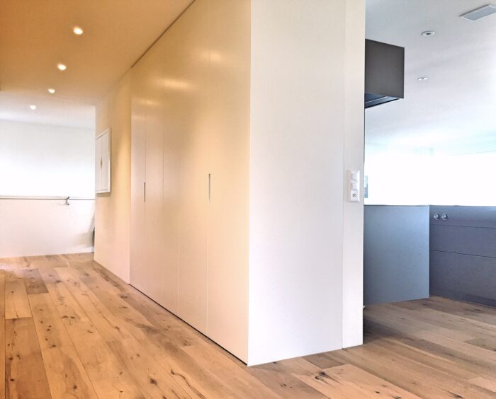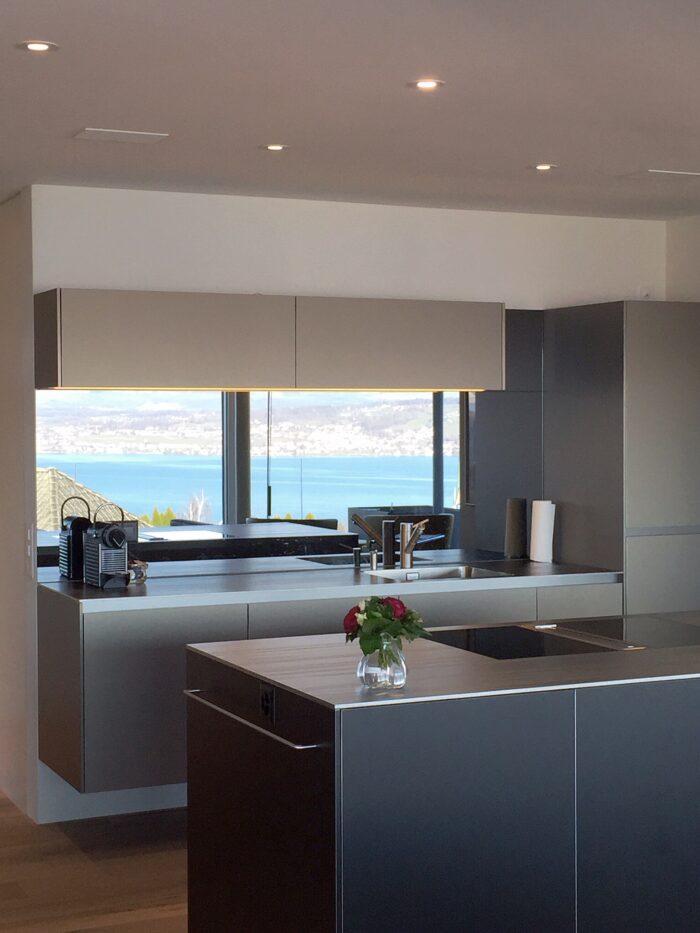 Zurück Neubau Eimfamilienhaus Richterswil Ausführung der Küche, Badmöbel und SchränkeMaterial: Edelstahl Ice Design, AluDuro, Eiche sägeroh, Corian Architektur: Hatt und Partner AGFotos: Reto Weiss