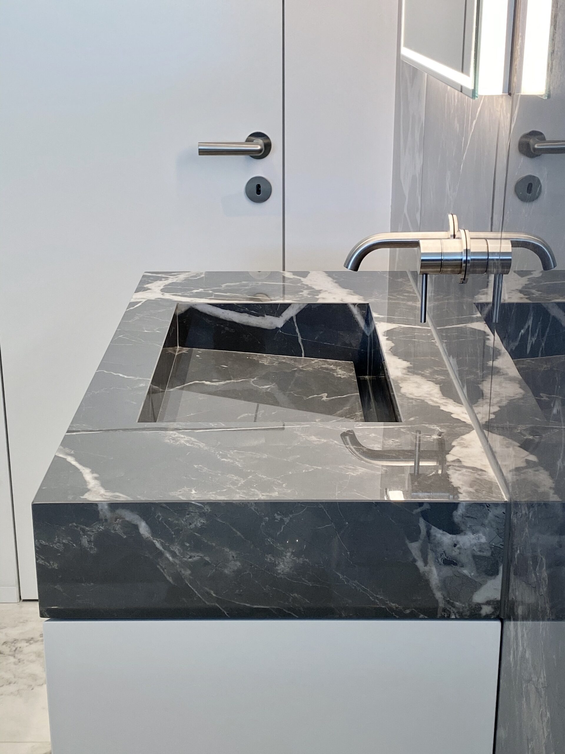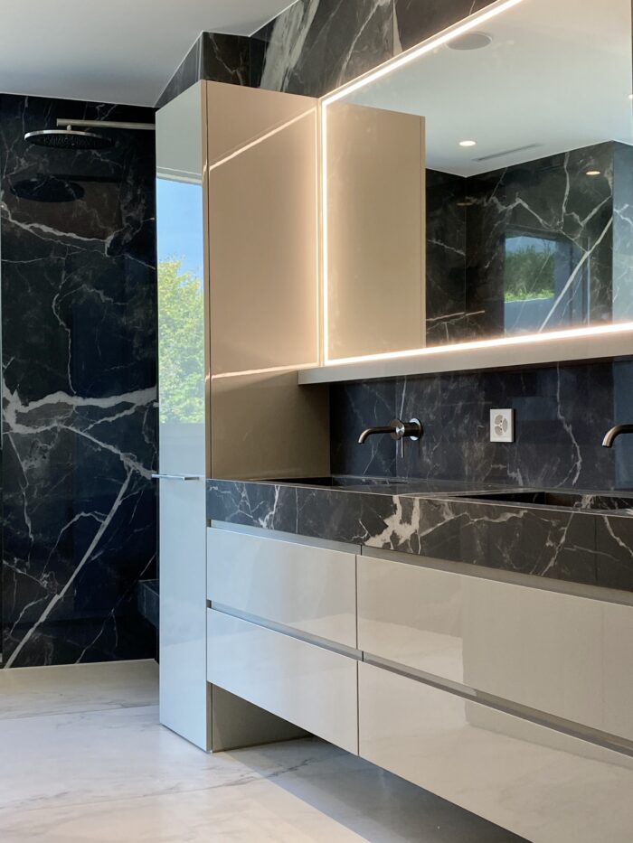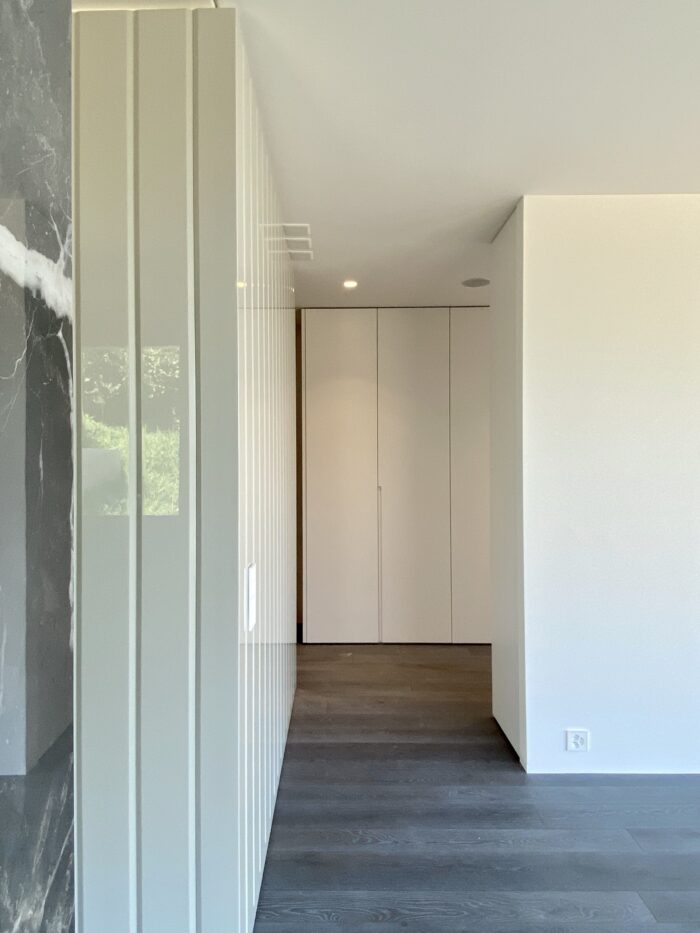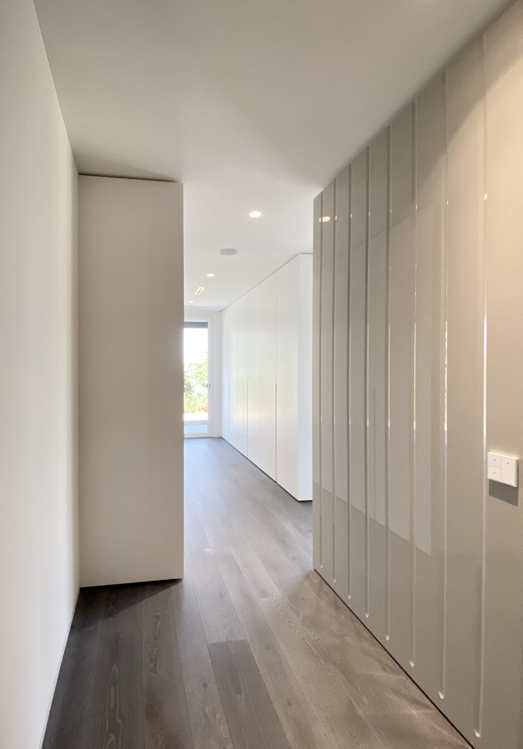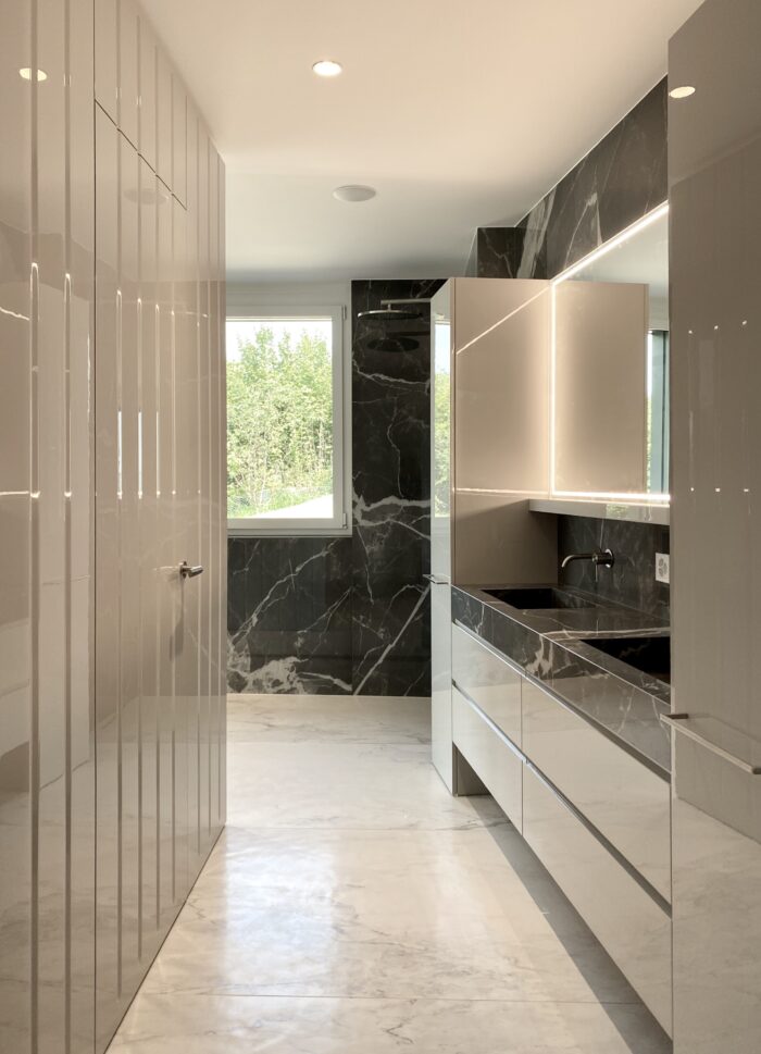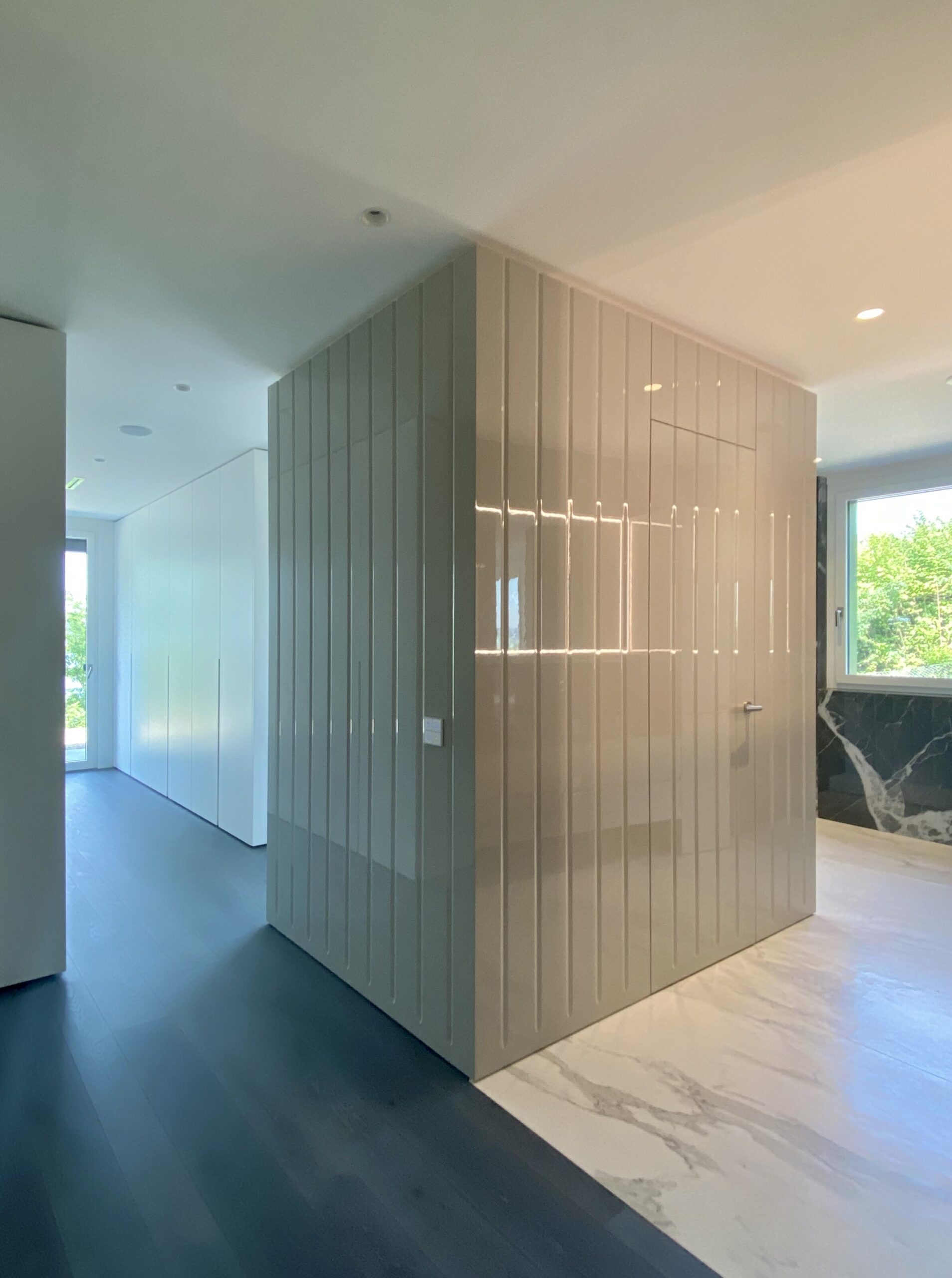 Zurück Neubau Haus W Ausführung von Schränke, Bäder, EinbautenMaterial: Feinsteinzeug, MDF Schleiflack/Hochglanz. Entwurf: Kalfopoulus, weiss innenausbau agFotos: Reto Weiss