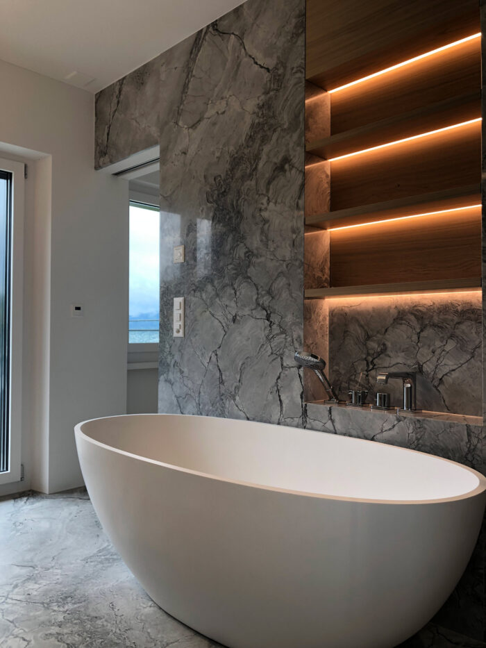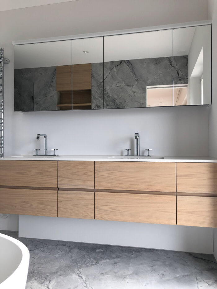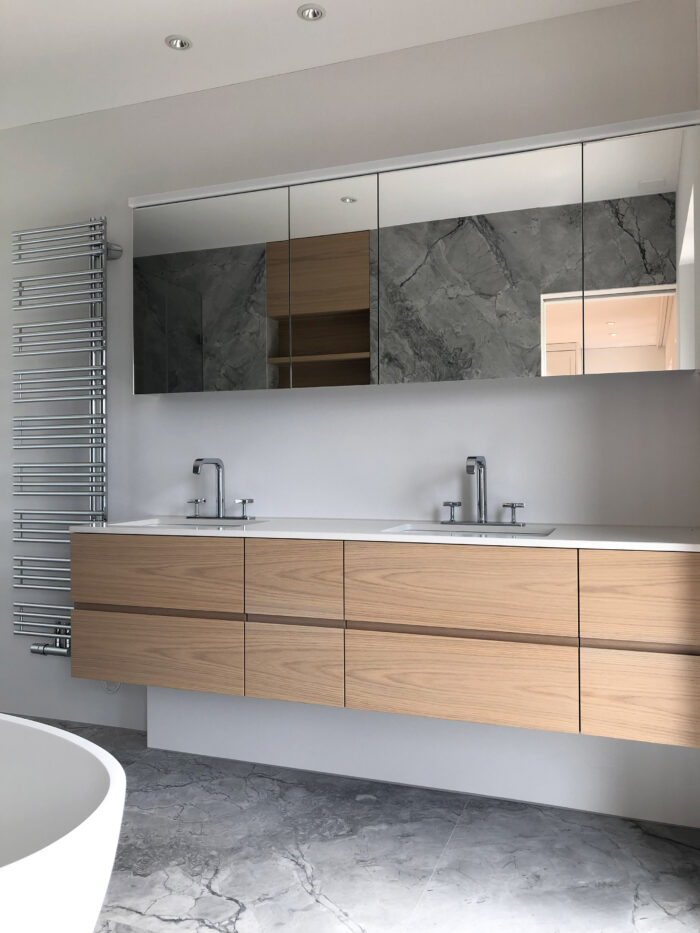 Zurück Renovation EFH PA Zollikon Ausführung von Bäder, Ankleiden, Möbel, allg. Schreinerarbeiten, Weinkeller.Material: Naturstein, Eichenfurnier, Schleiflack. Architektur: Nimmrichter Arch.8Entwurf: Nimmrichter Arch.8, Reto WeissFotos: Reto Weiss
