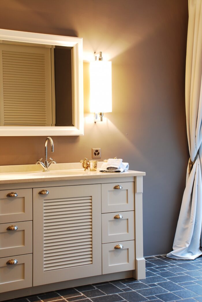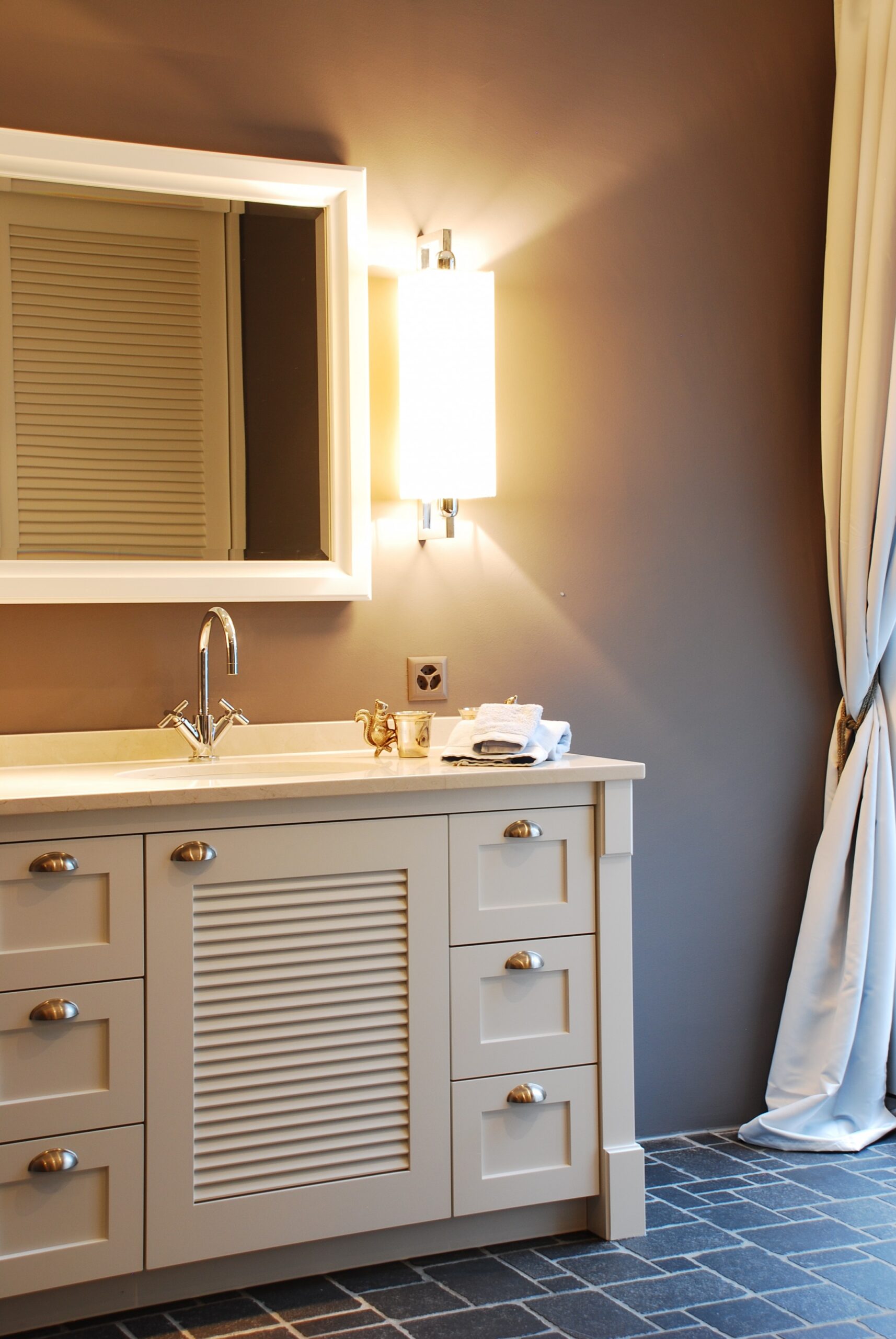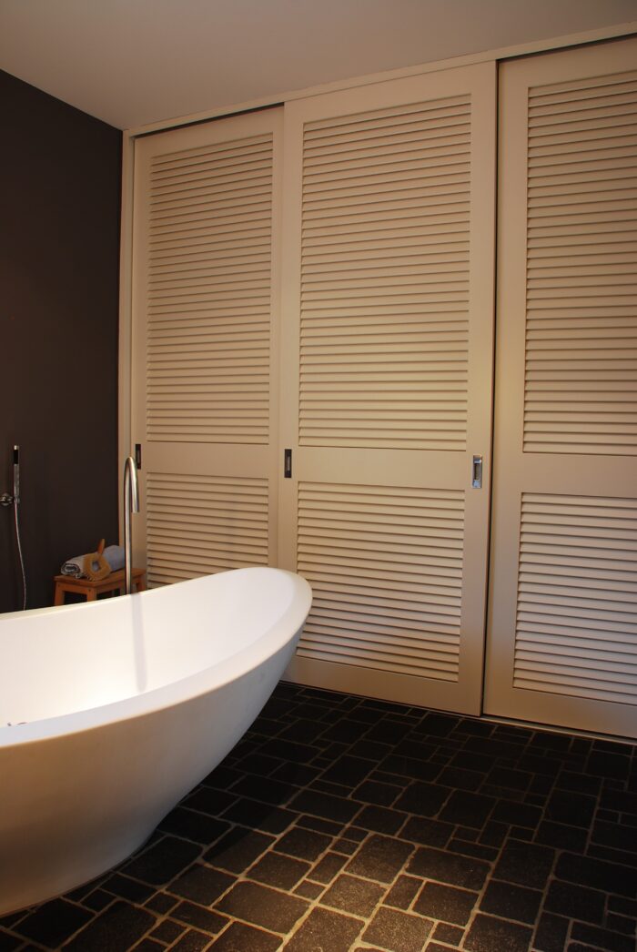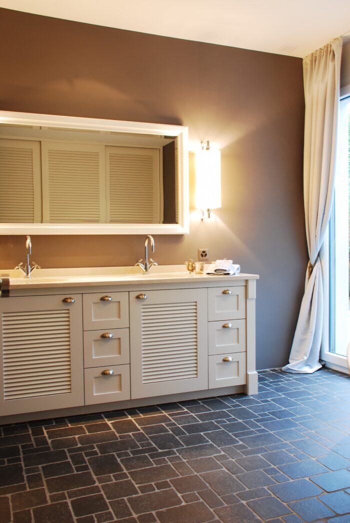 Material: Granit Nero assoluto satiniert, MDF Schleiflack, Eichenholz. Badmöbel aus Kalksandstein, Lamellentüren aus MDF Schleiflack