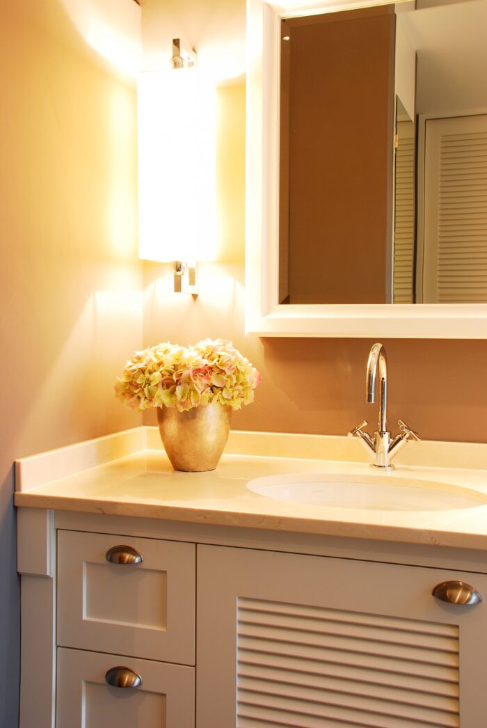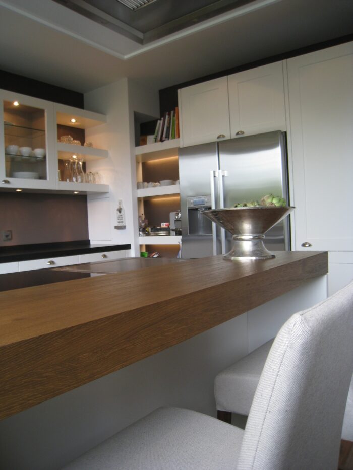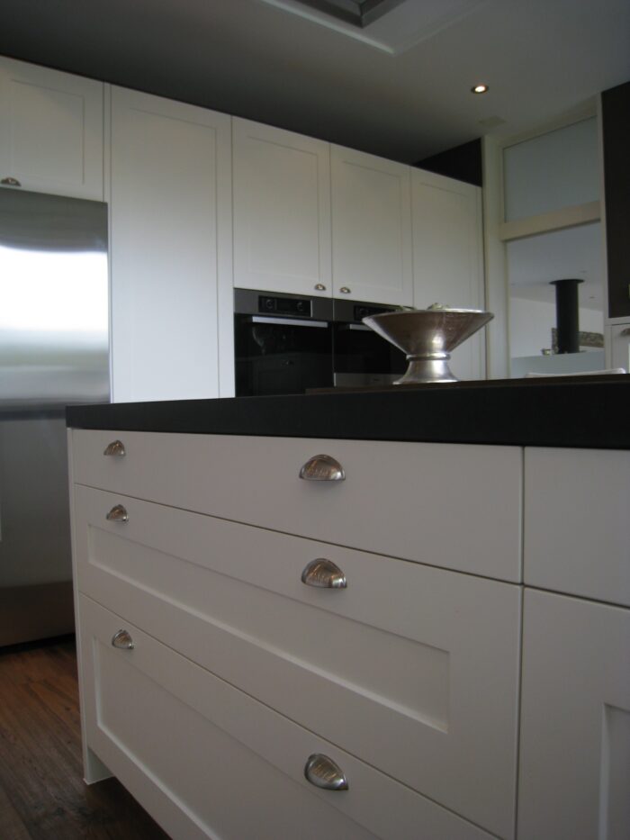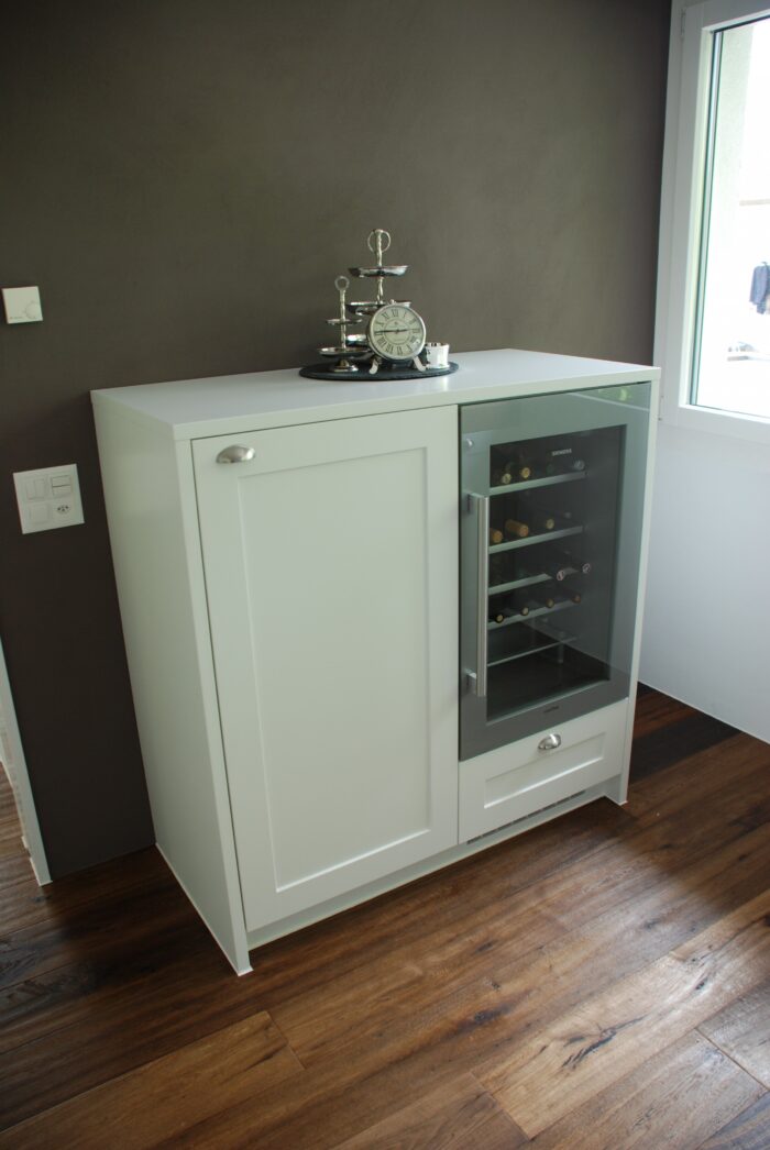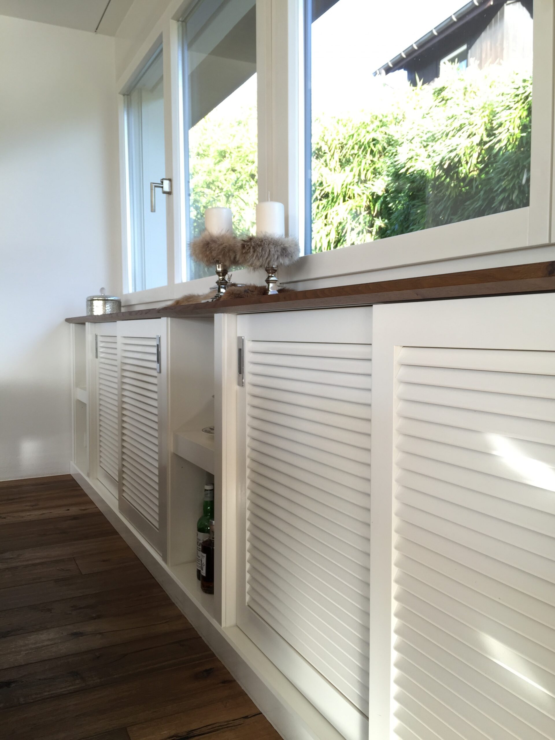 Material: Granit Nero assoluto satiniert, MDF Schleiflack, Eichenholz. Badmöbel aus Kalksandstein, Lamellentüren aus MDF Schleiflack